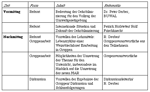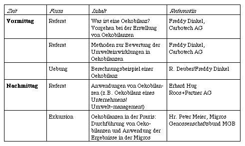 Die Teilnehmer des Kurses lernen die einzelnen Schritte, die Anwendungsbereiche, aber auch die Schwierigkeiten in der Durchführung von Oekobilanzen von ausgewiesenen Fachleuten aus der Praxis kennen. Besonderer Wert wird dabei auf den aktuellen und zukünftigen Stand der Methodik gelegt. Ein wichtiges Ziel ist die konkrete Umsetzung der Thematik in den Unterricht.